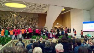 Francisco chegou à Sala Paulo VI às 10h30 e escutou o testemunho dos voluntários e das famílias. O Papa não queria se sentar na sede que costuma usar no local, mas se sentou ao lado da irmã Colacchi em uma das arquibancadas da Sala.