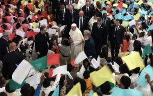 O Pontífice chegou à “cidade da amizade” em papamóvel e foi recebido pelo sacerdote Opeka, no qual o Santo Padre deu um forte abraço, enquanto as pessoas no interior do auditório os saudava com ovações.